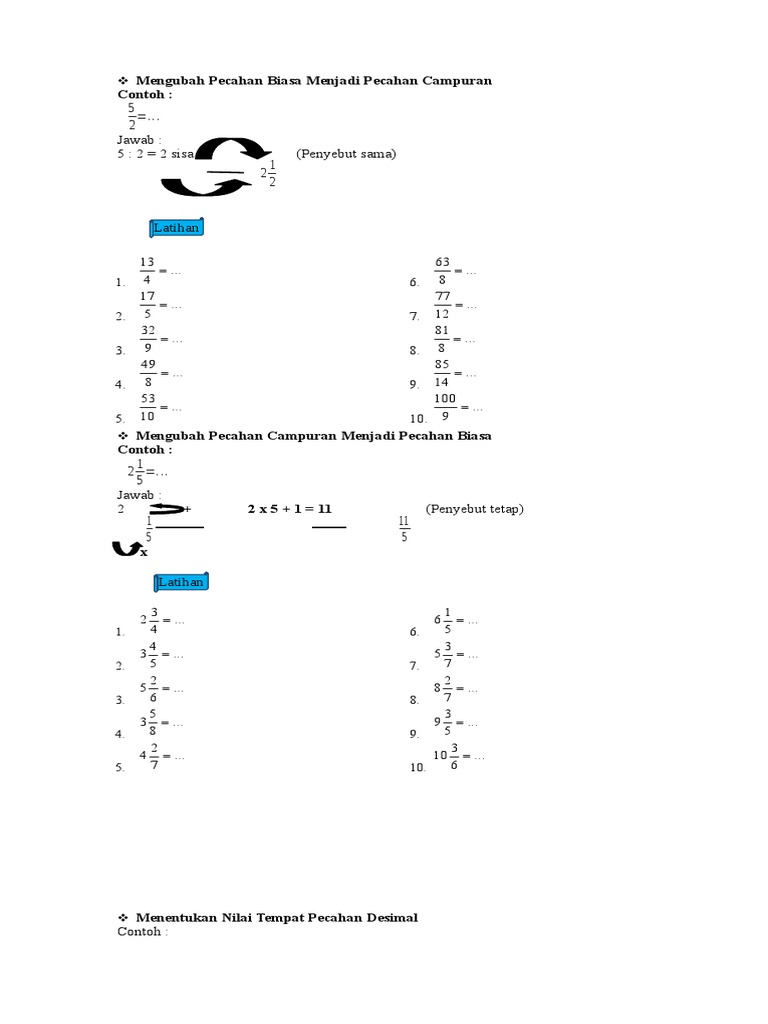 Cara mengubah desimal menjadi pecahan biasa atau campuran adalah dengan mengubah bentuk desimal menjadi pecahan berpenyebut 10, 100, 1.000, atau seterusnya. Pecahan biasa (proper fraction), pecahan tidak biasa (improper fraction), dan pecahan campuran (mixed fraction). Untuk menjumlahkan pecahan biasa dengan pecahan campuran, kita ubah pecahan tersebut ke bentuk pecahan biasa. Buah apel yang akan diperoleh tiap anak adalah satu buah apel dan setengah buah apel. Pembulatan pecahan biasa, campuran, desimal, dan persen pembulatan pecahan biasa.